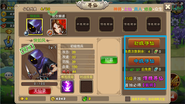 4、点击寻仙进行招募,玩家可进行初级、中级等招募。