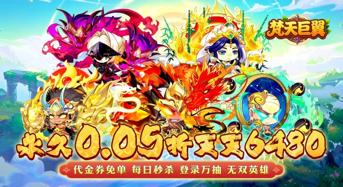 梵天巨翼(0.05折天天6480)是一款三国乱斗放置卡牌开箱游戏,内置无限充值卡、代充卷,全场礼包0.05折,创角领取666钻石、高级招募*5、钞票6666礼包。天天送充6480代金券,让你免费就可以玩的超爽。梵天巨翼开箱手游采用大量嘻哈搞怪的人物形象和炫酷爆笑的战斗表现效果,重构有温度的三国世界。在这里玩家们收集三国中各路武将,它们都将以全新形象呈现,搭配武将前往闯关战斗,前期需要玩家手动点击屏幕攻击,有了武将后即可自动战斗获得宝箱,宝箱可开出武将、钞票、装备等资源,有了资源即可升级我们的角色。随着玩家闯关进度提升,后续还会解锁厉练、主城模式,在其中拥有专治不服、过关斩将、精英挑战、试炼副本等多种玩法体验!
