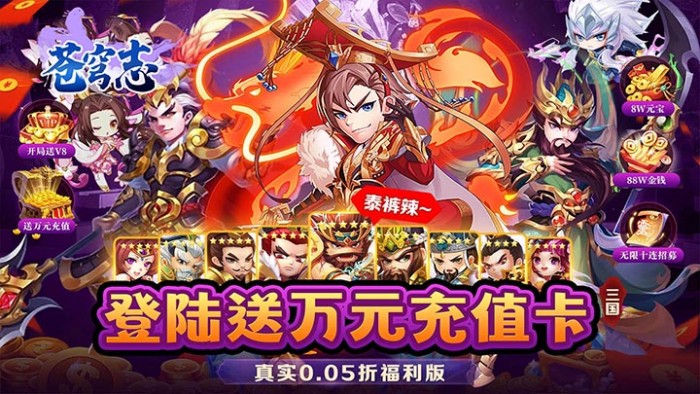 《苍穹志(神武三国0.05折)》是一款以三国历史为背景的高福利策略卡牌手游,融合名将收集、阵容搭配与跨服争霸等核心玩法。游戏采用破底0.05折充值机制,充值648元仅需3.24元,创角即送VIP8、天神级神将、全套橙装及海量资源,每日登录再送大量神将令,轻松召唤关羽、吕布、诸葛亮等传奇武将。万元级充值福利免费领,VIP礼包层层解锁,零氪玩家也能快速组建无敌阵容。支持挂机推图、自动战斗、离线收益,策略与福利并重,助你轻松横扫魏蜀吴,问鼎乱世之巅!