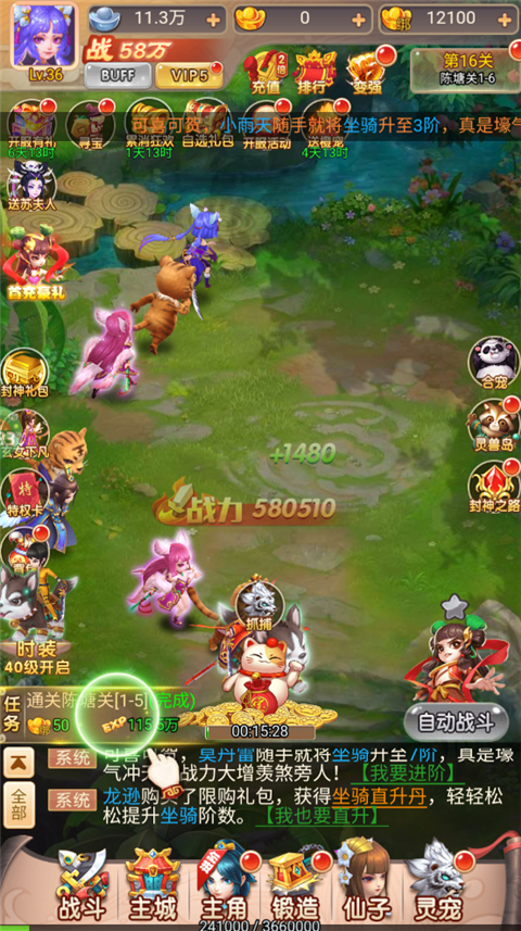 高福利轻松开局:创角即送VIP5、百万元宝、极品灵宠(如雷震子),登录15天再领超凡神宠,零氪玩家快速成型。