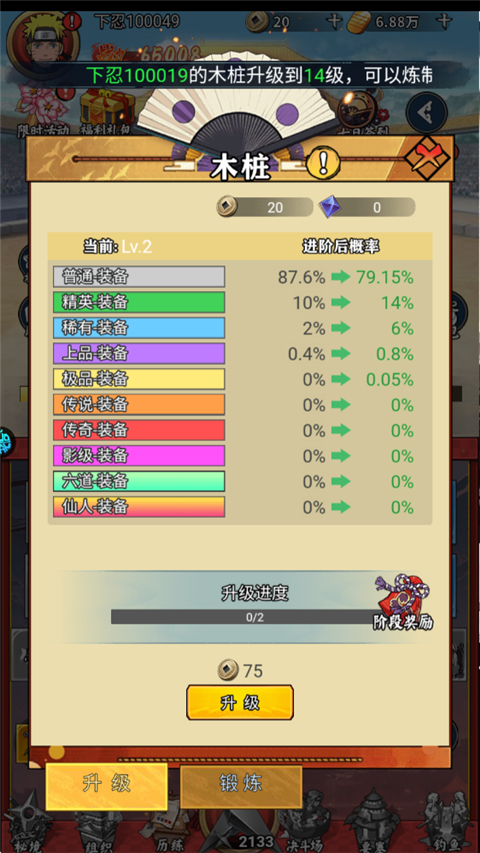 4、装备品质与木桩有关系,可以升级来提升高品质掉落几率;