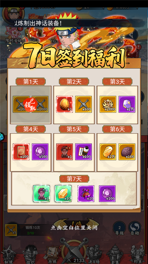 3.福利连击:登录奖励持续轰炸,次日送红色异兽,第五天和第七天分别赠送传说乃至传奇忍者,养成之路畅通无阻。