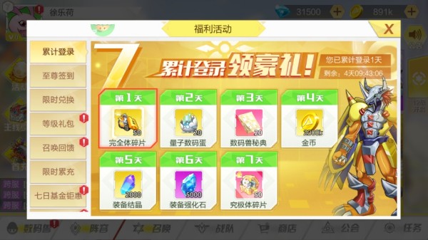 完成新手任务与七日目标,稳定领取500抽,集齐全套究极体阵容。