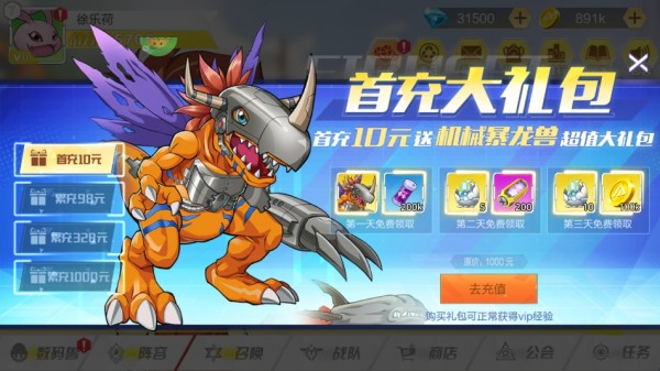 4、首充10元送机械暴龙兽超值大礼包