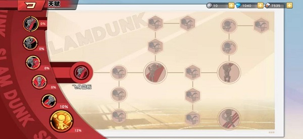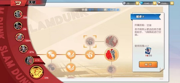 3、不同玩家的操作习惯不同,选择解锁天赋的顺序也会有很大不同。拿樱木花道来说,技能为:飞人(大招)、飞身篮板、庶民上篮、超级加速、哼哼防守和扑球。