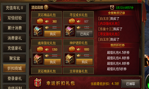 2、开服时,区服会固定有一个特惠礼包活动,推荐购买里面的神装礼包既可以在前期获得足够夺得战力来挑战boss,又可以省去一部分强化的消费,而且价格公道(十块都不到的价格)