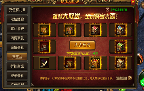 5、聚宝盆活动,纯拼运气的活动,但是奖励也非常可观,抽奖的元宝消耗会一次次递增,建议认真考虑在抽,认为自己福星高照就可以尝试(运气好抽到王者礼包就够我吹一年了)