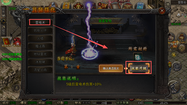 3、跟随新手指引点击雷电术强化技能开始打怪